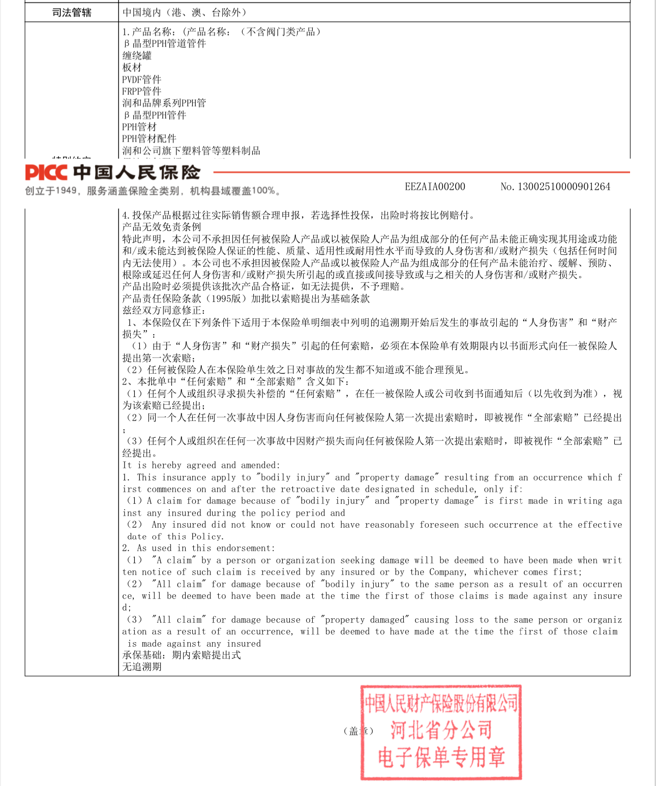 江苏AG尊时凯龙人生就工程塑业工厂所生产所有β晶型PPH管阀件、PVDF管阀件、FRPP管阀件及板材缠绕罐等均由PICC承保,为您的项目企业保驾护航。多一份保障,多一份信任。
